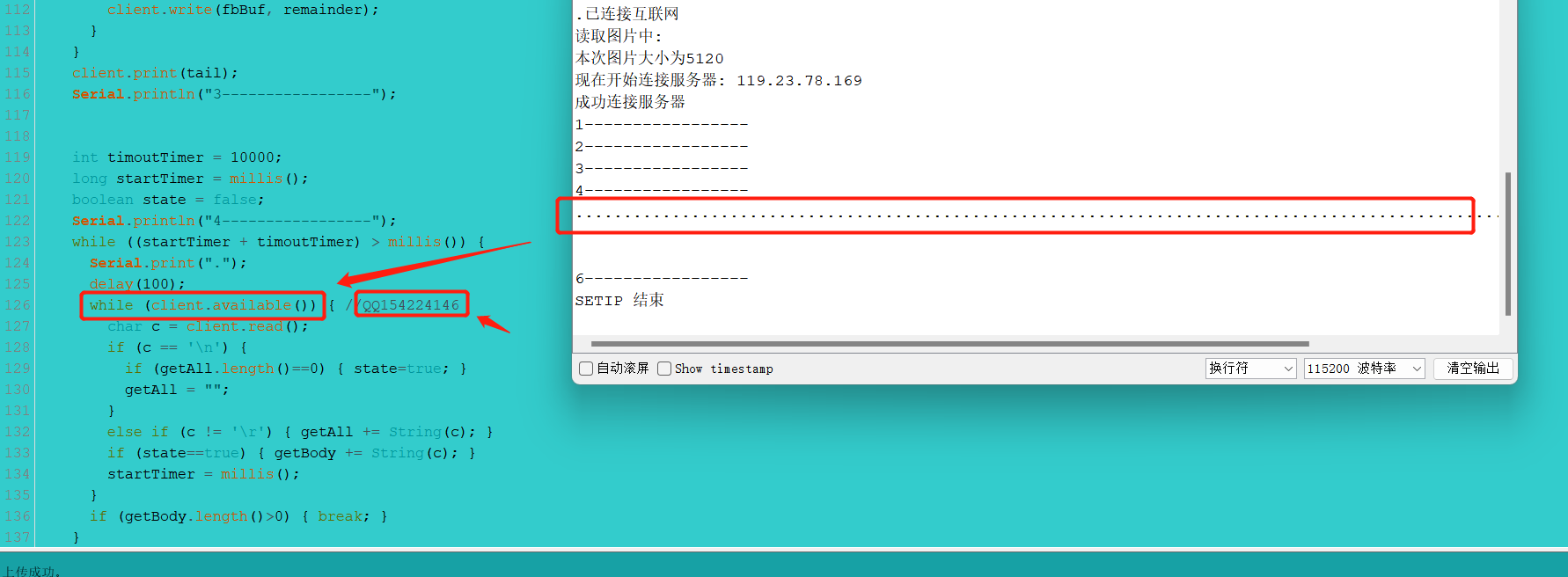 问些问题,麻烦指导一下。主要是我这边编译那句head不通过,我后来找了另外一个描述,最后能编译,连接服务器也没问题,但是在client.available()的时候变成了………..,这啥情况呀。是跟我head修改了而无法读取么